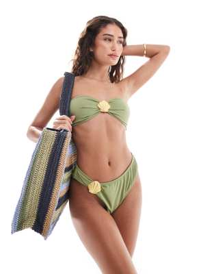 Tag : Bikini Verde Oliva De Top Con Escote Palabra De Honor Y Braguitas Con Detalle De Concha Dorada