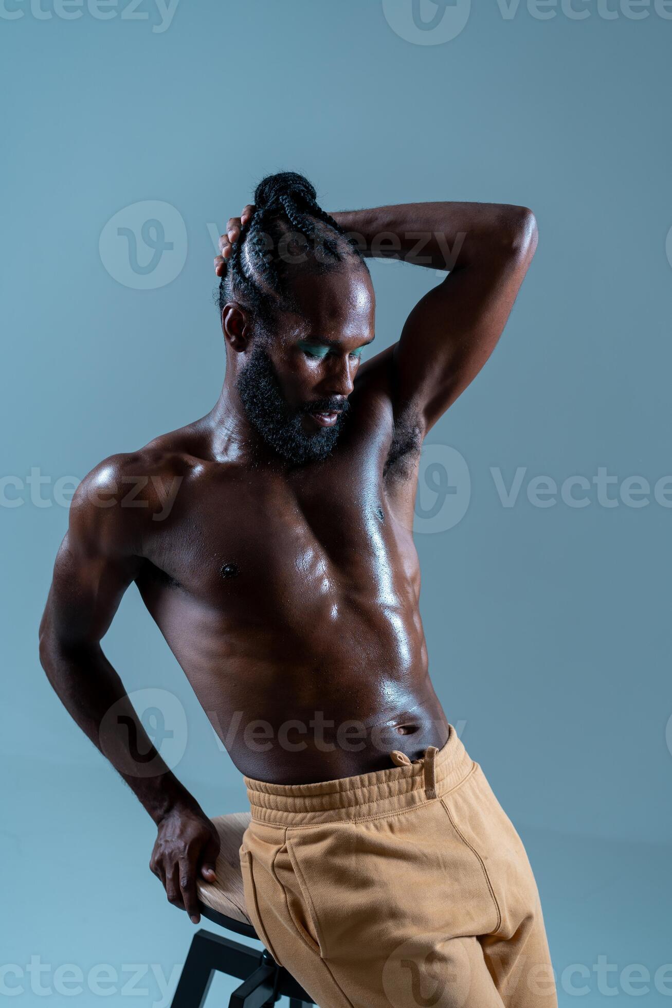 Black Shirtless Gay Model Posing While Leaning On Stool In Studio Stock Photo At Vecteezy is a popular picture for sexy and hot.