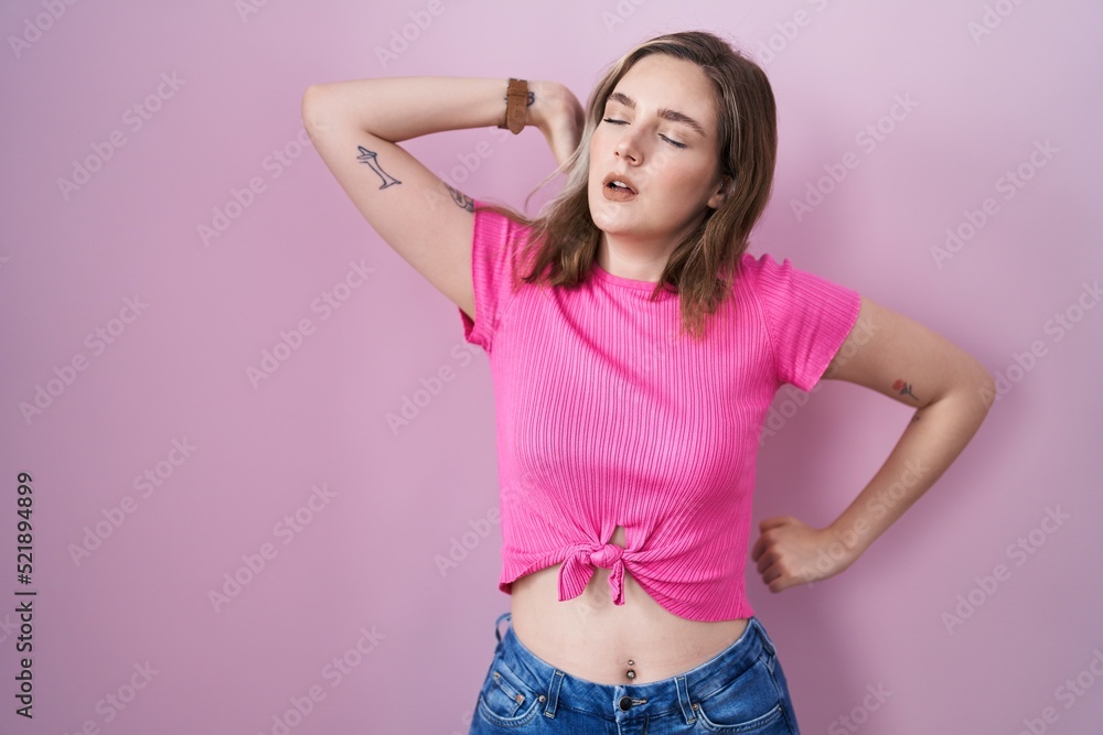 Blonde Caucasian Woman Standing Over Pink Background Stretching Back Tired And Relaxed Sleepy is a popular picture for sexy and hot.