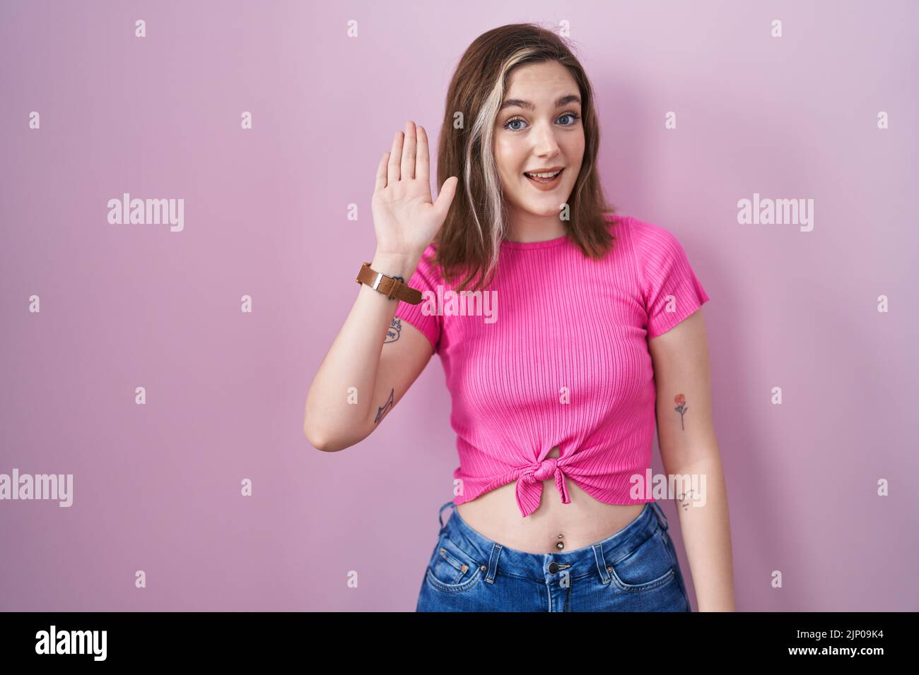 Tag : Blonde Caucasian Woman Standing Over Pink Background Waiving Saying