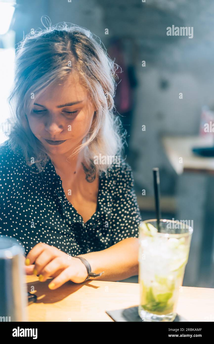 Tag : Blonde Girl Checking Her Phone In A Cocktail Bar Stock Photo Alamy