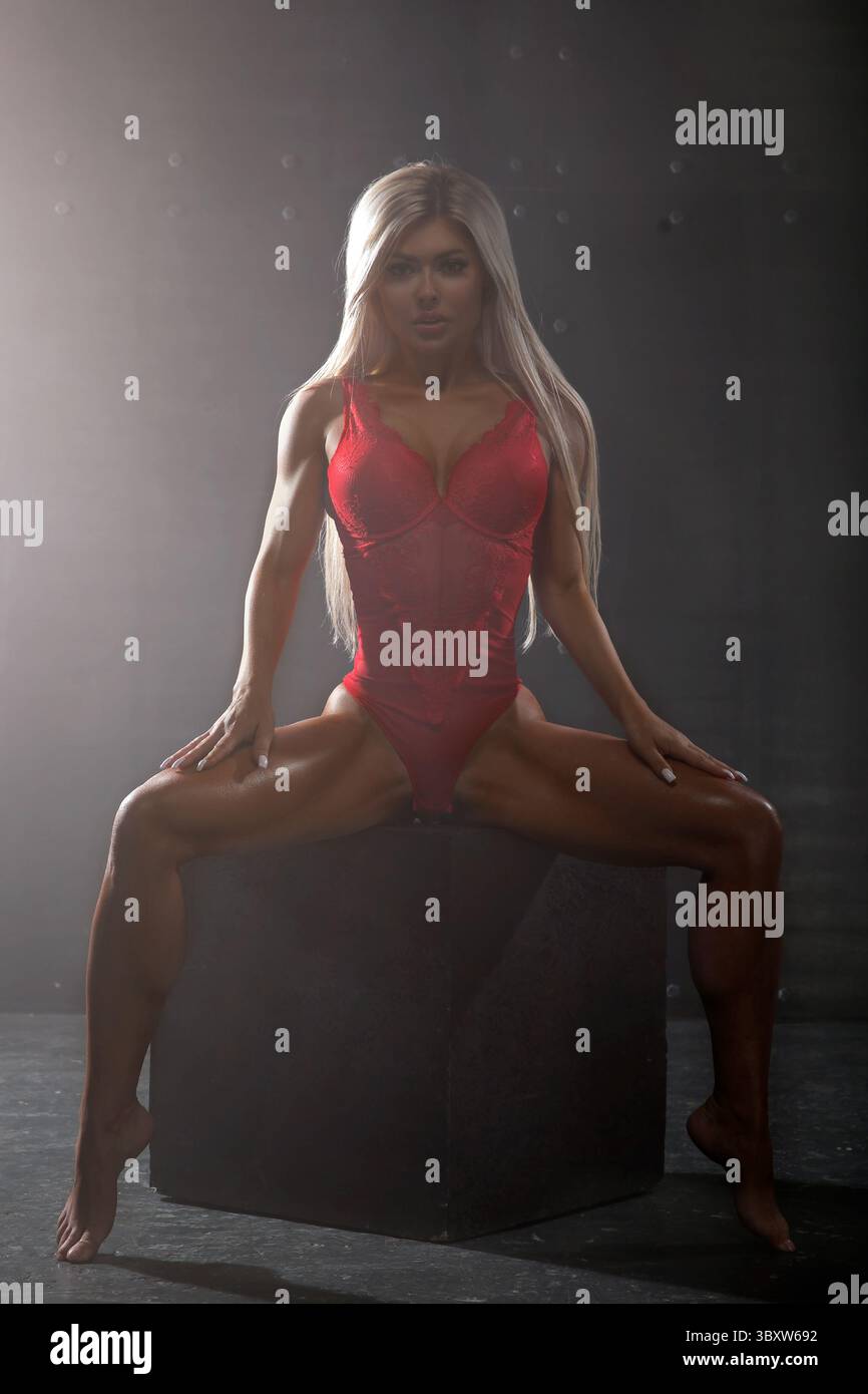 Tag : Blonde Woman Athlete Confidently Poses In Striking Red Outfit Emphasizing Her Toned Physique