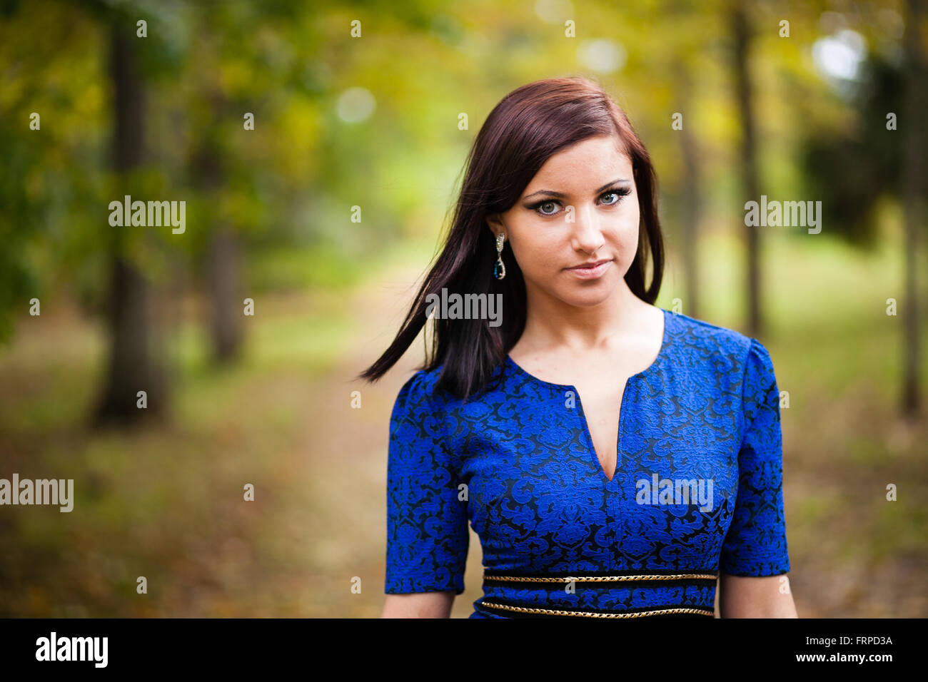 Tag : Brunette Girl In Blue Dress Walking At Park Stock Photo Alamy