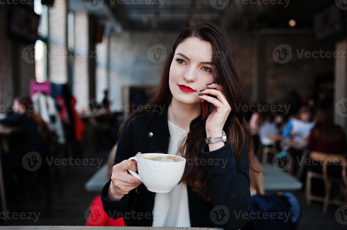 Brunette Girl Sitting On Cafe With Cup Of Cappuccino And Speaking Mobile Phone Stock pictures has 500 x 400 · 50 kB · jpeg.