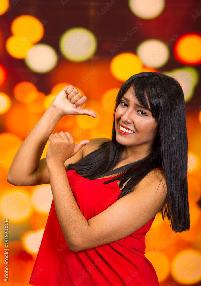 Brunette Model Posing Happily In Front Of Blurry Lights Background Interacting Using Hands