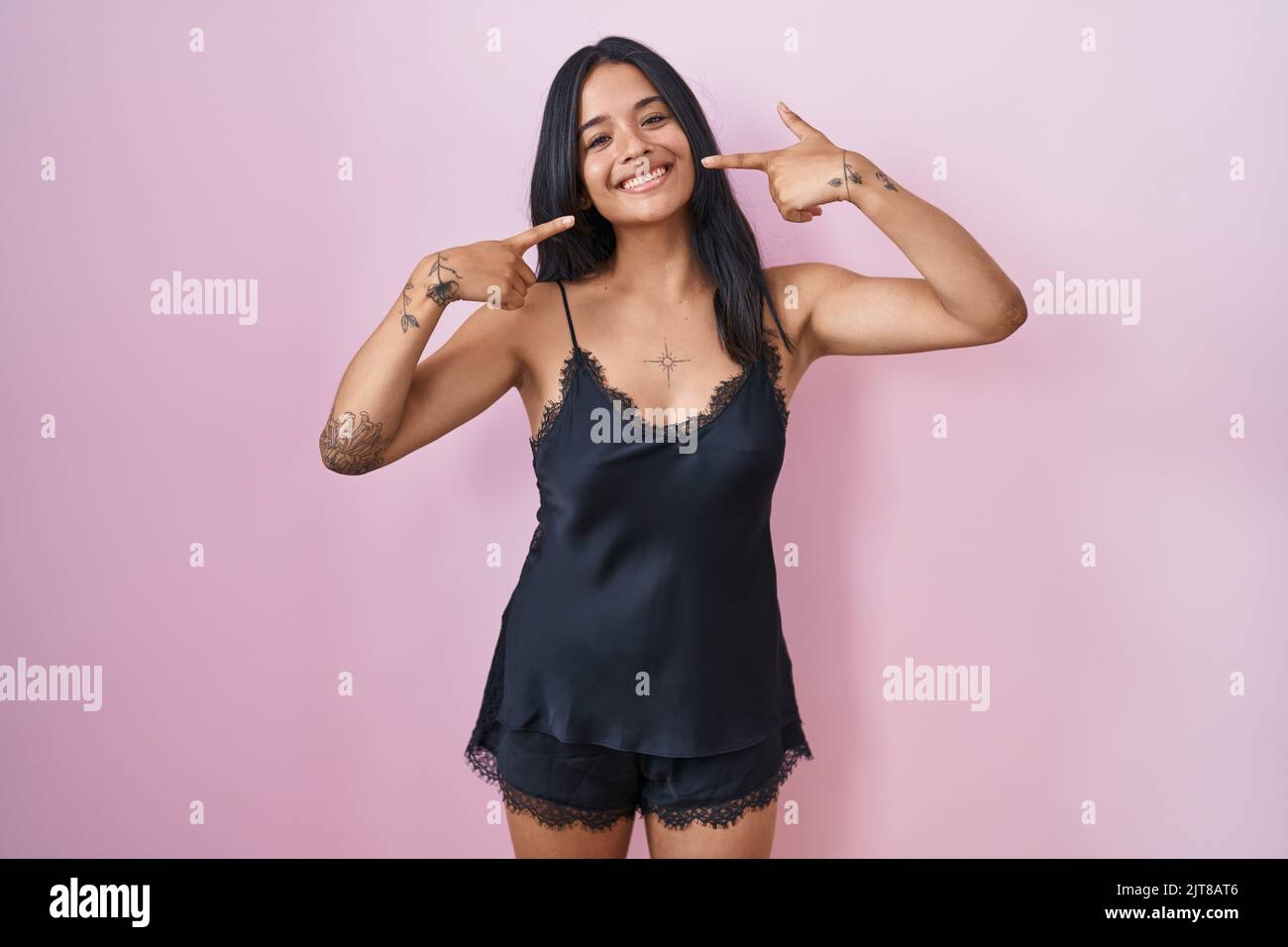 Brunette Woman Wearing Black Pajama Smiling Cheerful Showing And Pointing With Fingers Teeth And is a popular picture for sexy and hot.