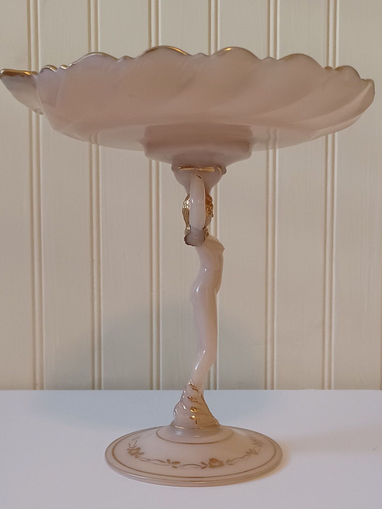 Cambridge Glass Nude Compote Dish Hand Painted Shell Shape Gold Trim Pink With Pink And Purple