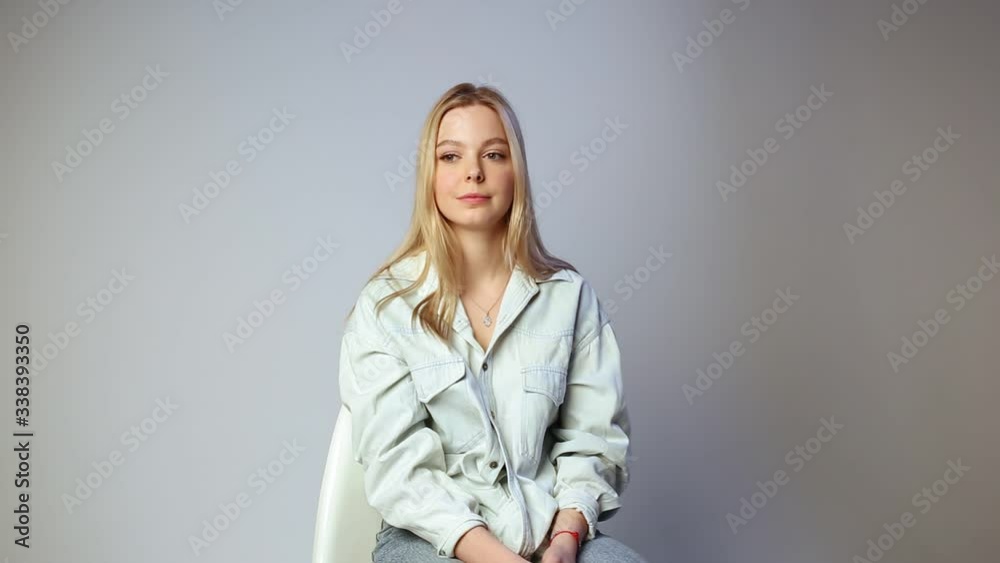 Tag : Caucasian Pretty Girl With Long Blonde Hair Sits On Chair Smiles On White Background Cute