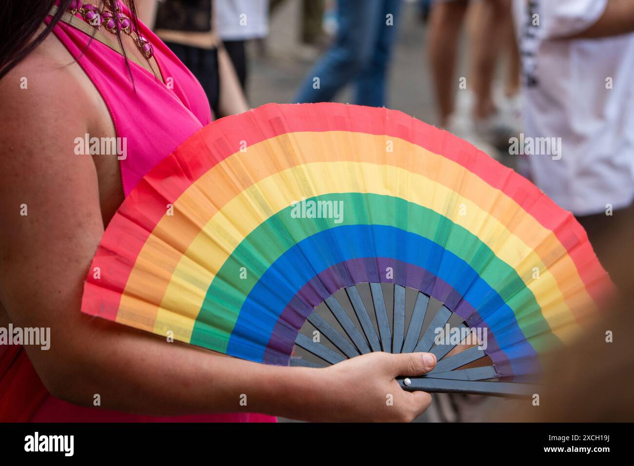 Tag : Closeup Of A Participant Of The Gay Pride Parade Holding A Rainbow Fan The Event Celebrates