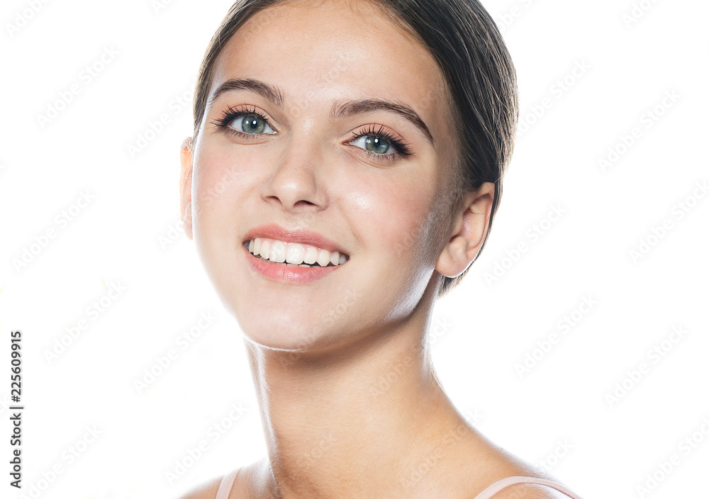 Tag : Closeup Portrait Of Attractive Caucasian Smiling Woman Brunette Isolated On White Studio Shot