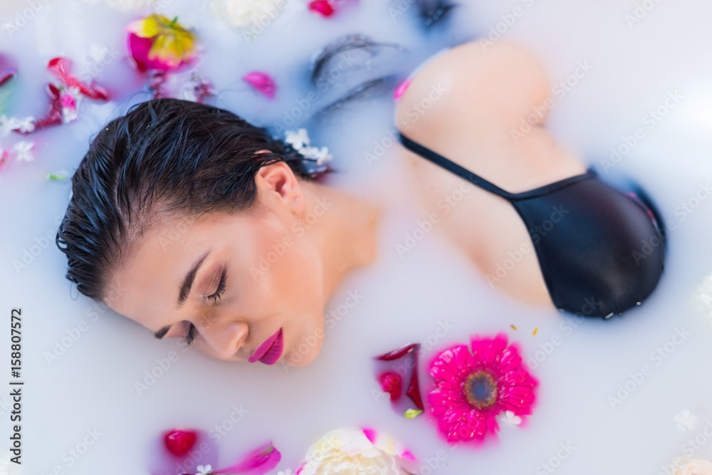 Tag : Closeup View Of Sexy Brunette Woman Lying On One Side In A Hot Bath With Flowers She Is Wearing