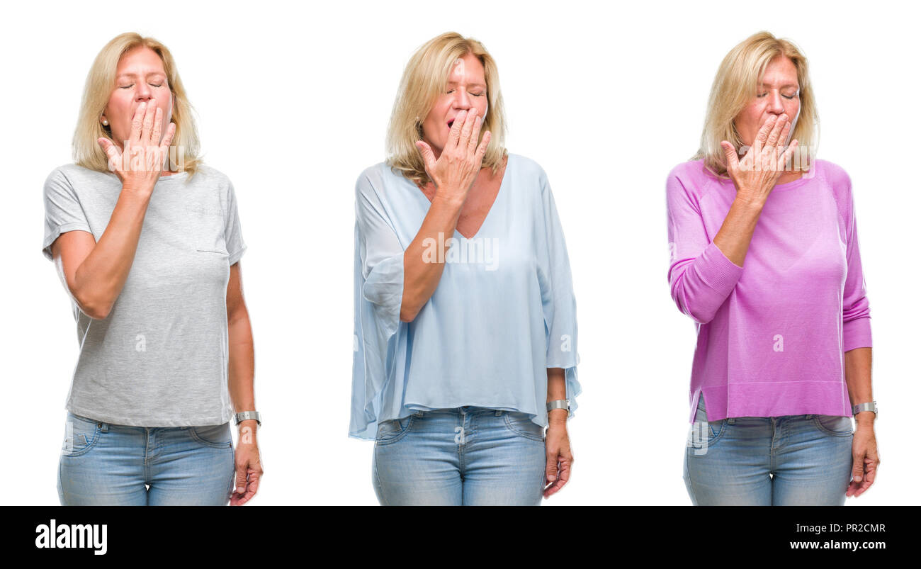 Collage Of Beautiful Middle Age Blonde Woman Over White Isolated Backgroud Bored Yawning Tired is a popular picture for sexy and hot.