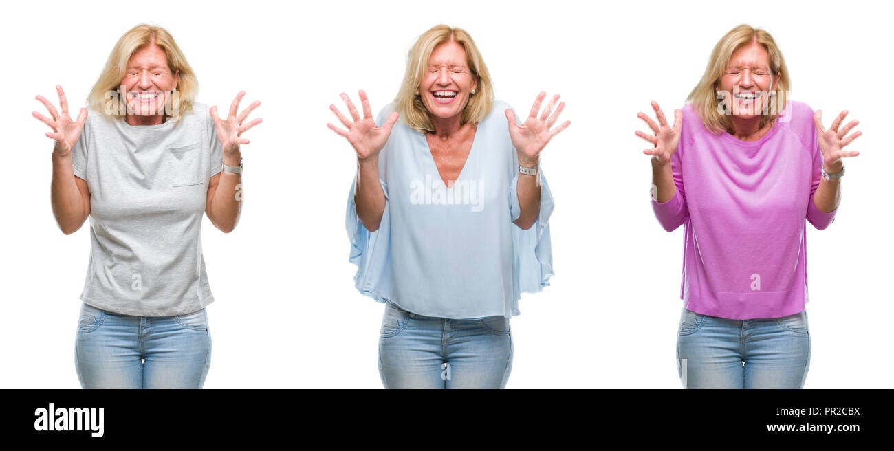 Collage Of Beautiful Middle Age Blonde Woman Over White Isolated Backgroud Celebrating Mad And is a popular picture for sexy and hot.