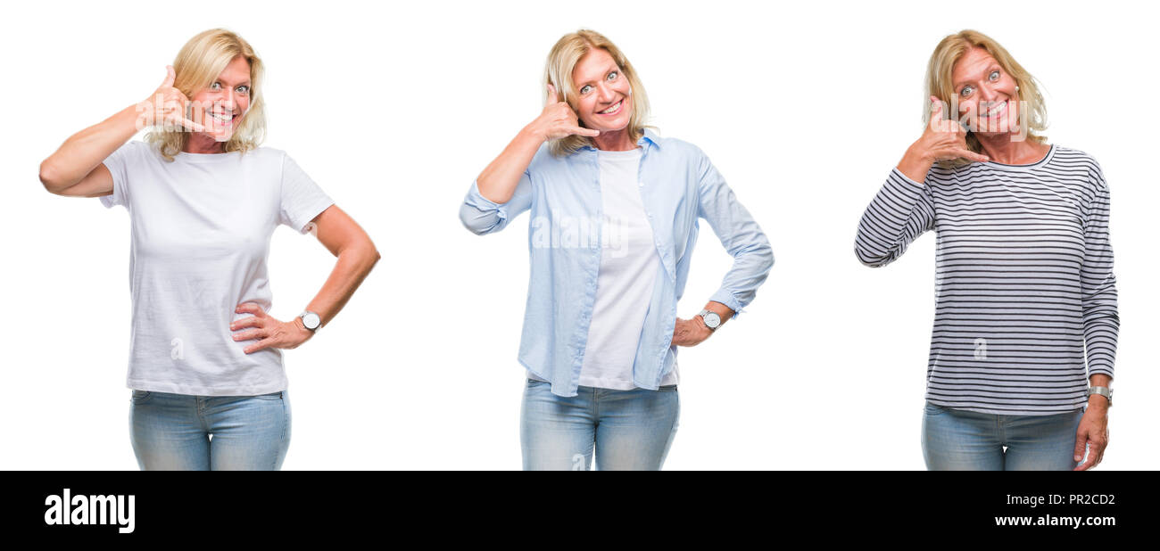 Tag : Collage Of Beautiful Middle Age Blonde Woman Over White Isolated Backgroud Smiling Doing Phone