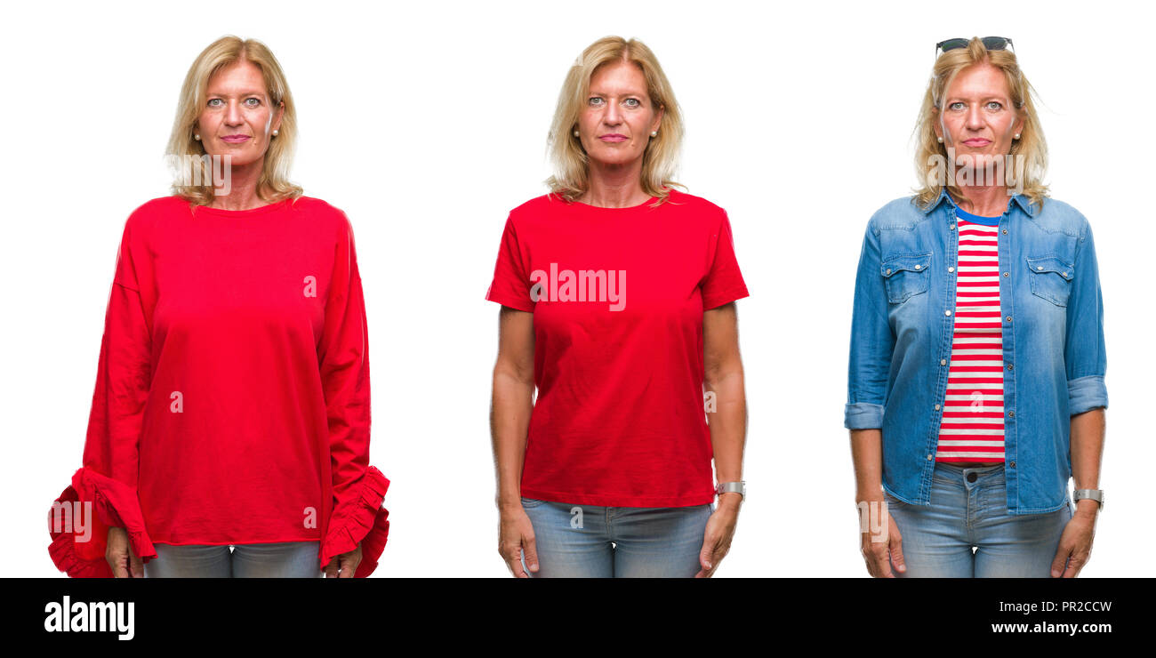 Tag : Collage Of Beautiful Middle Age Blonde Woman Over White Isolated Backgroud With Serious