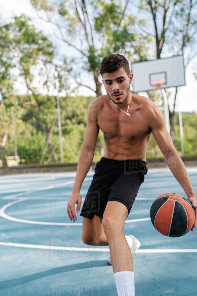 Tag : Concentrated Male Athlete With Naked Torso Playing Basketball Alone On Sports Ground In Summer