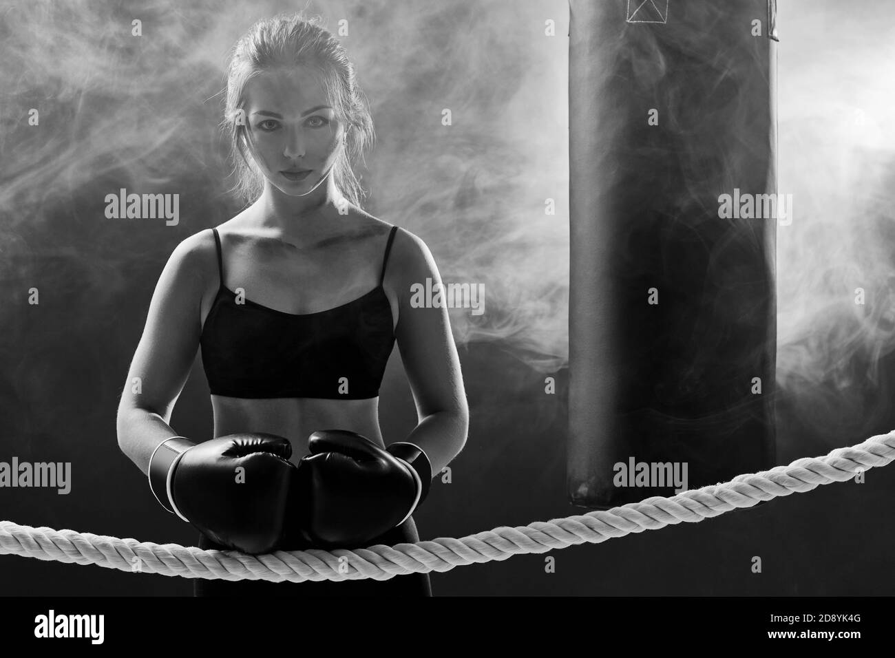 Tag : Confident Athletic Brunette Woman In Boxing Gloves And Sportswear On Dark Background With Smoke
