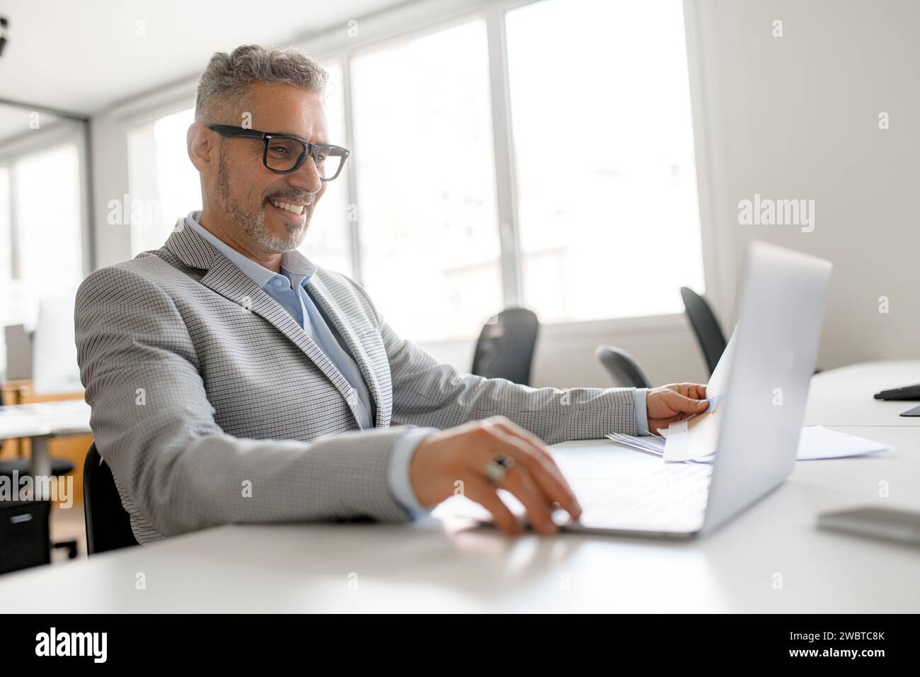 Tag : Confident Mature Businessman Using Laptop In Loft Office Space Friendly Senior S Male