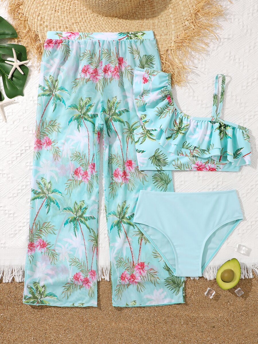 Tag : Conjunto De Bikini Con Estampado Tropical Y Ribete De Volantes Con Pantal N De Cubrici N Para