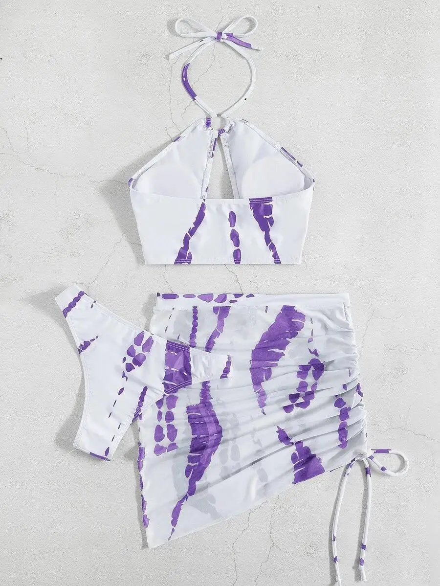 Custom New Sexy Print Piece Bikini Set Beach Wear With Mesh Skirt Bandeau Halter Swimsuit