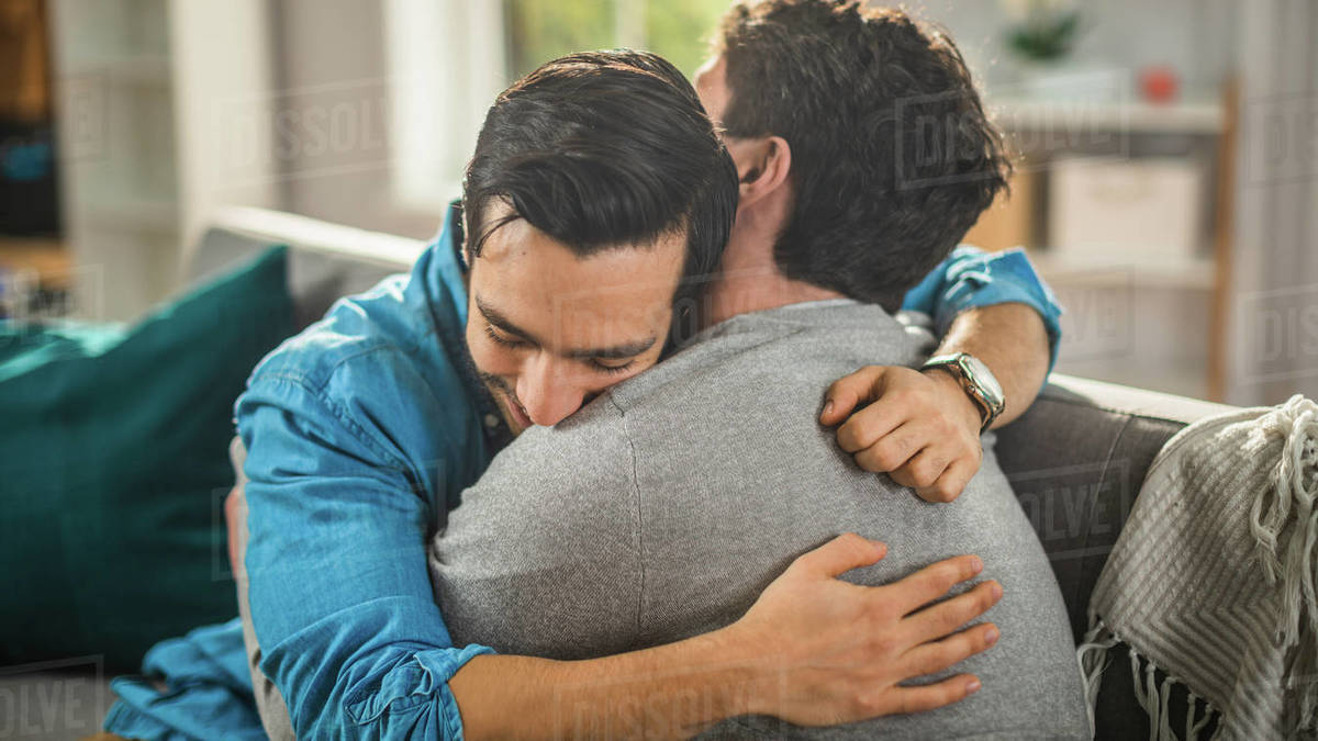 Tag : Cute Attractive Male Gay Couple Sit Together On A Sofa At Home Boyfriends Are Hugging And