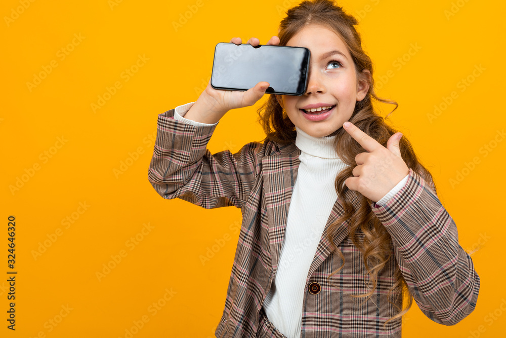 Tag : Cute Blonde Girl In A Classic Jacket Shows A Phone With A Mockup On A Yellow Background With