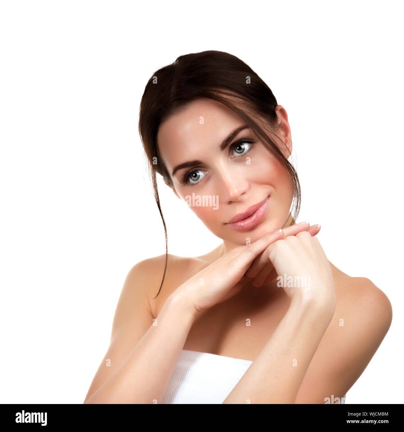 Tag : Cute Female Enjoy Dayspa Closeup Portrait Of Innocent Brunette Girl Isolated On White