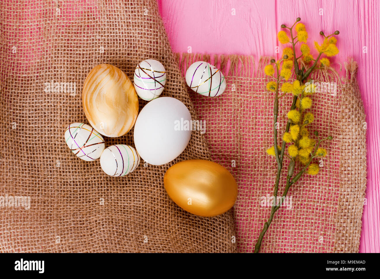 Decorative Easter Eggs On Burlap Festive Easter Spring Composition With Pussy Willow And Eggs