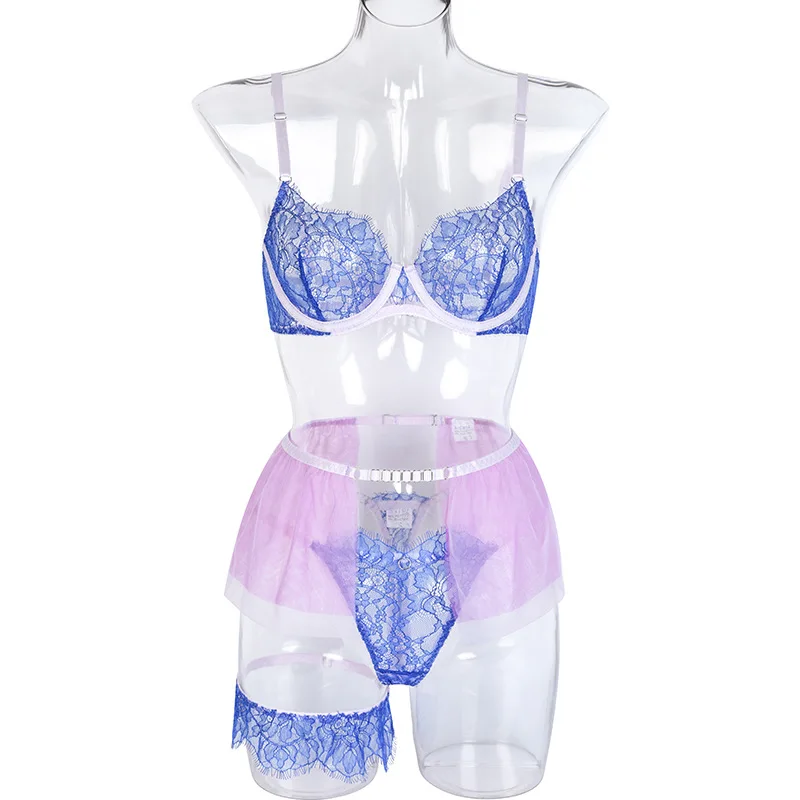 Tag : Deep Love New Arrival Sensual Lingerie Lace Patchwork Purple Lingerie Set With Leg Belt Accept
