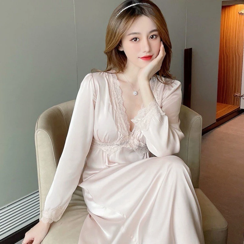 Tag : Deep V Neck Nightgown Sexy Women Satin Sleepwear Palace Nightdress Lingerie Female Kimono