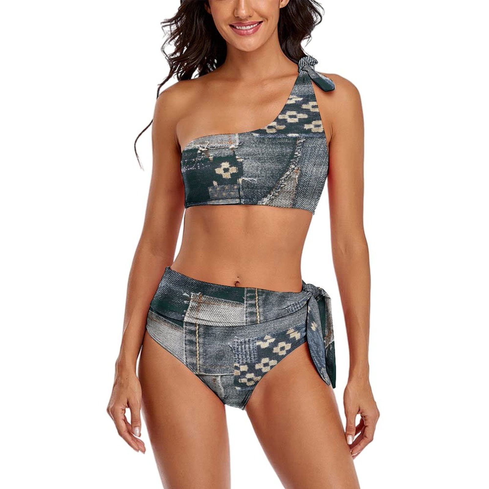 Tag : Denim Patchwork One Shoulder Bowknot Swimsuit Two Piece Swimsuit Knot Crop Top Bikini High