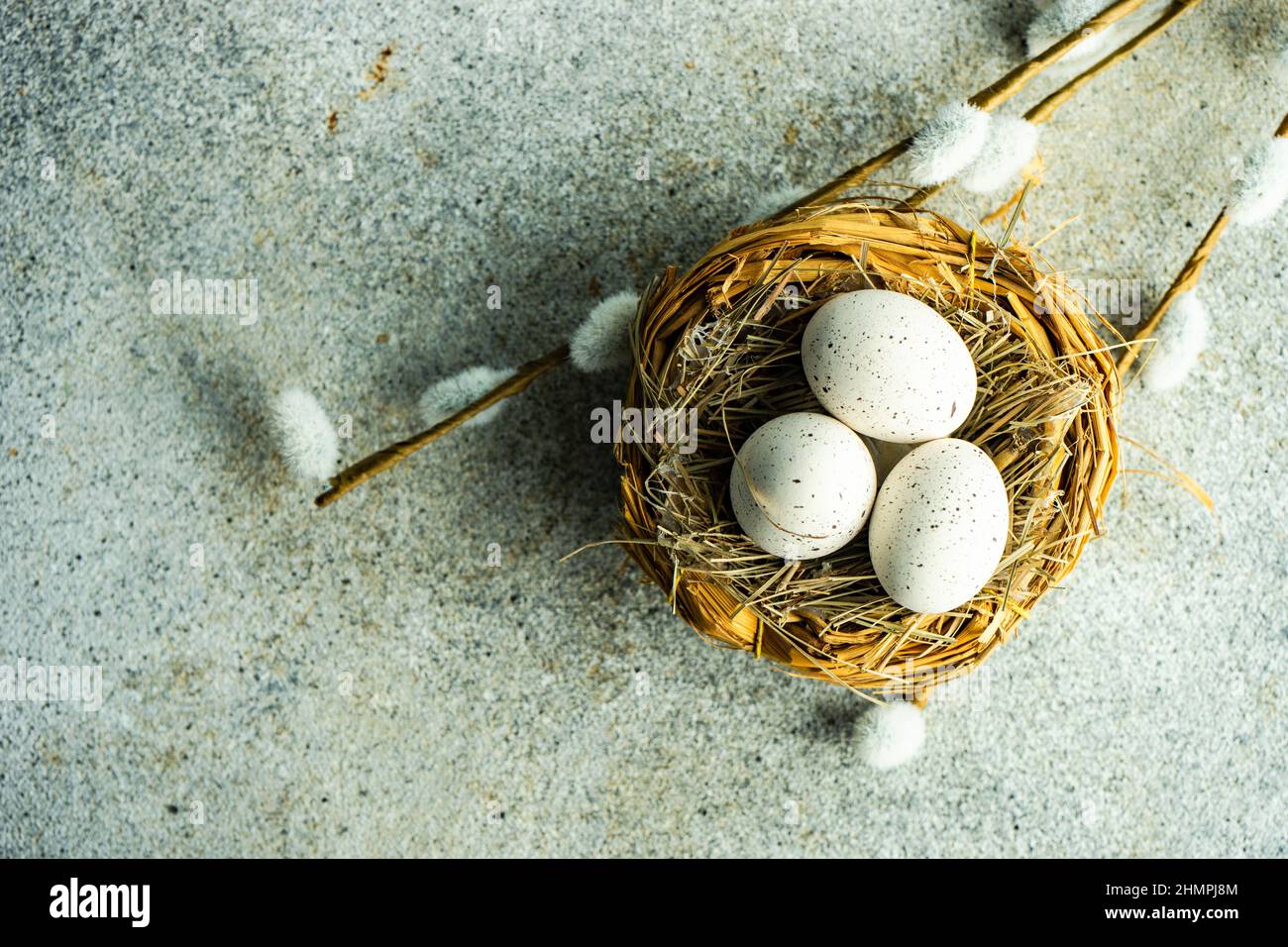 Easter Eggs And Feathers In A Bird S Nest With Pussy Willow Decorations On A Table Stock Photo pictures has 500 x 400 · 50 kB · jpeg.