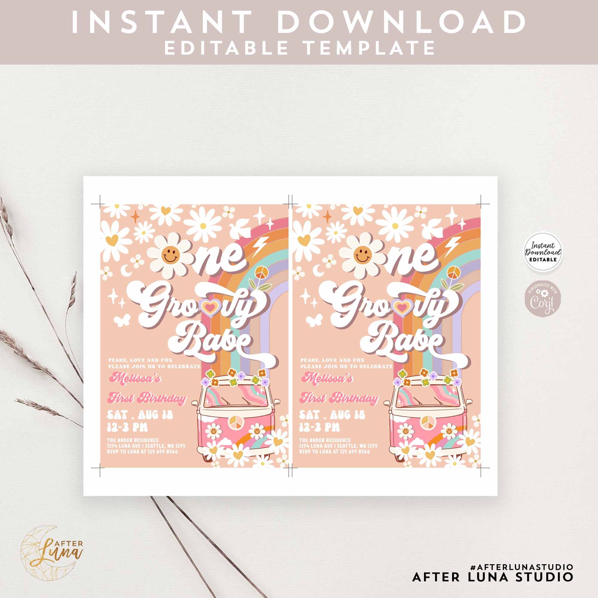 Editable Pink One Groovy Babe Daisy Rainbow Groovy Van St Birthday Invite Hippie Party