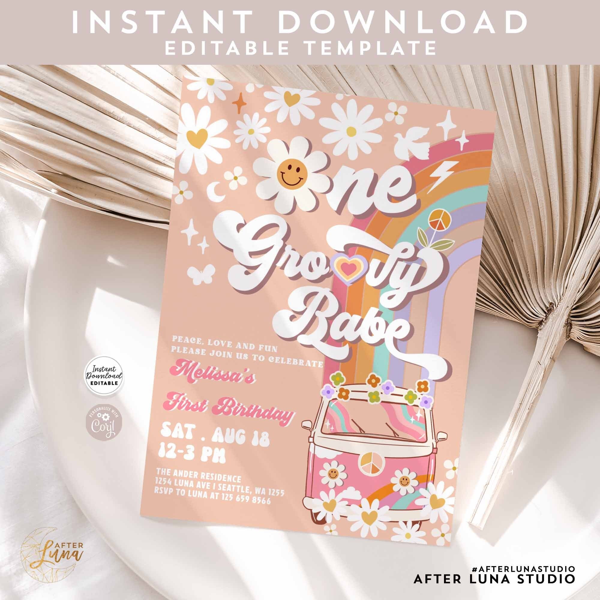 Editable Pink One Groovy Babe Daisy Rainbow Groovy Van St Birthday Invite Hippie Party