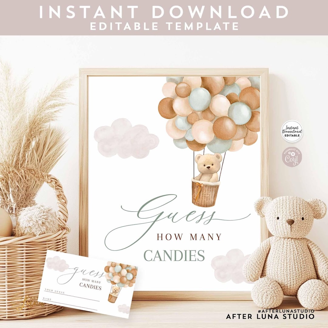 Tag : Editable Teddy Bear Sage Green Hot Air Balloon Baby Shower Guess How Many Game We Can Beary Wait