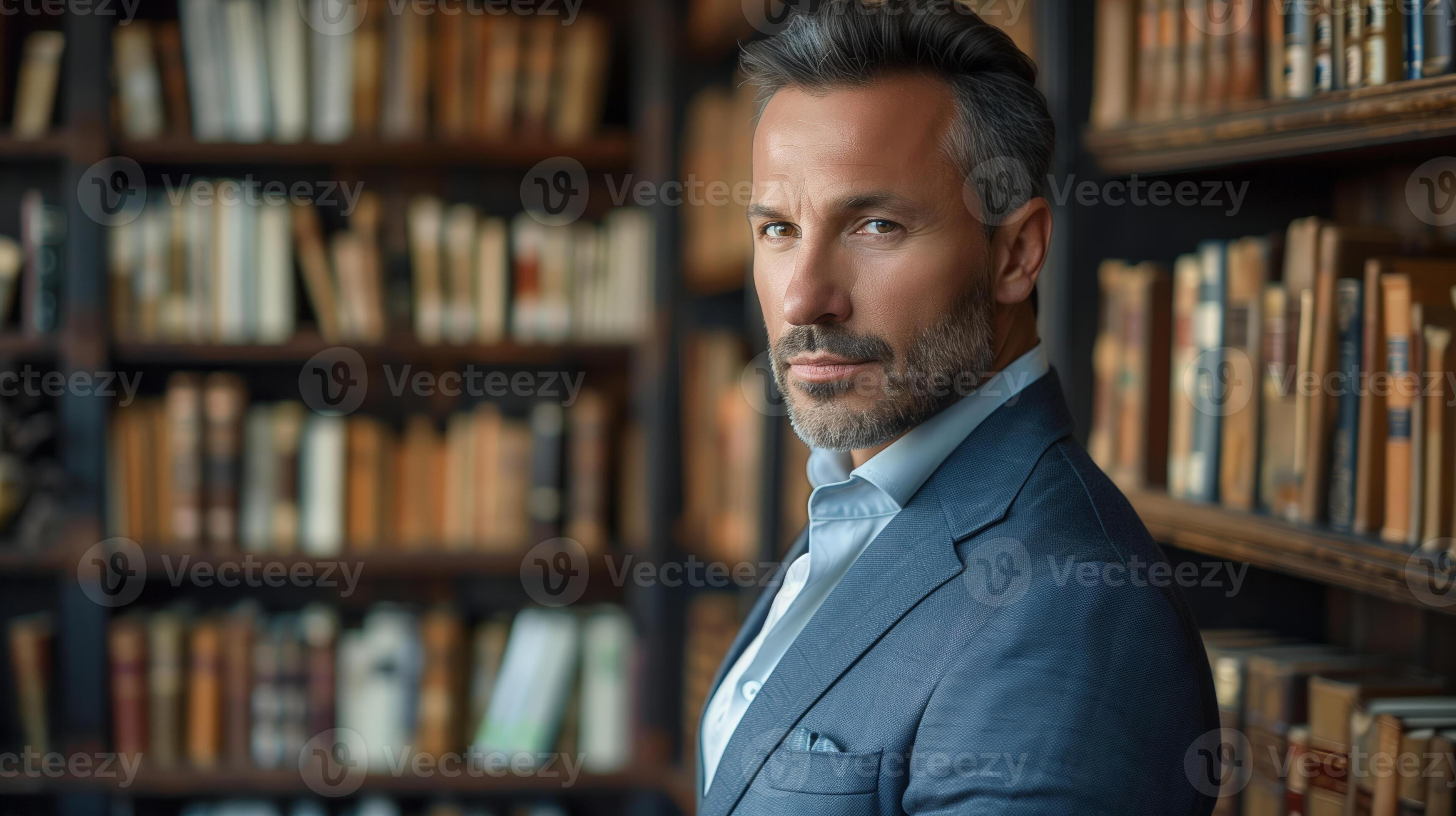 Tag : Elegant Mature Businessman In Blue Suit Posing Confidently In Front Of A Classic Library