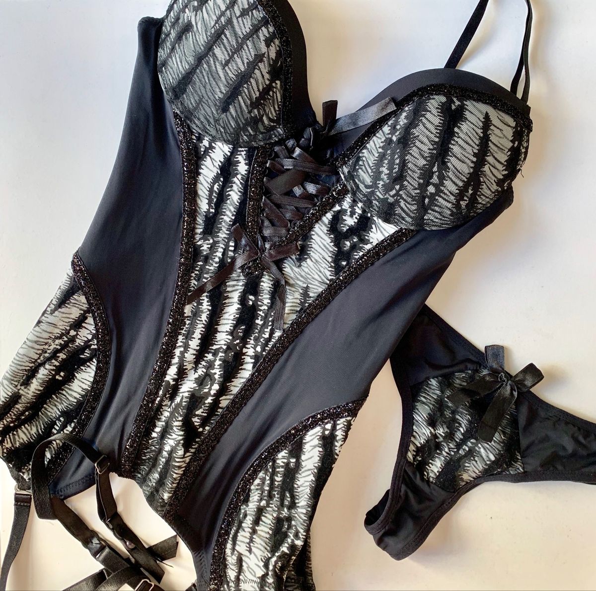 Espartilho Corpete Preto Zebra Glitter Cinta Liga Lingerie Feminina Beijo Roubado Nunca is a popular picture for sexy and hot.