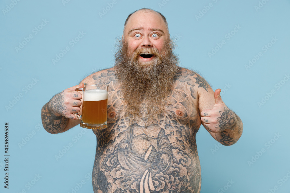 Tag : Excited Fat Pudge Obese Chubby Overweight Man Has Tattooed Naked Bare Big Belly Hold Glass Of