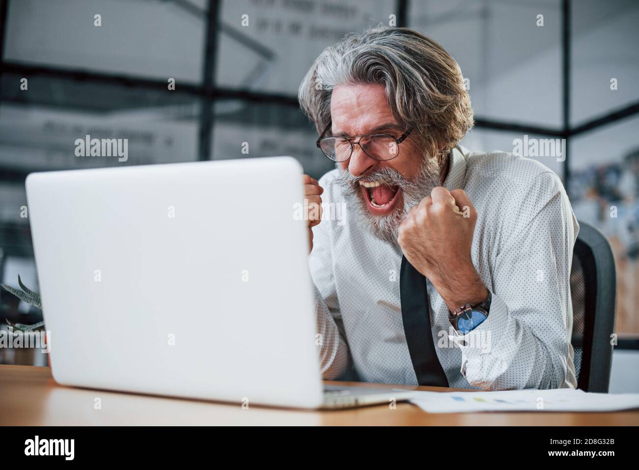 Tag : Expressive Mature Businessman With Grey Hair And Beard In Formal Clothes Is In The Office