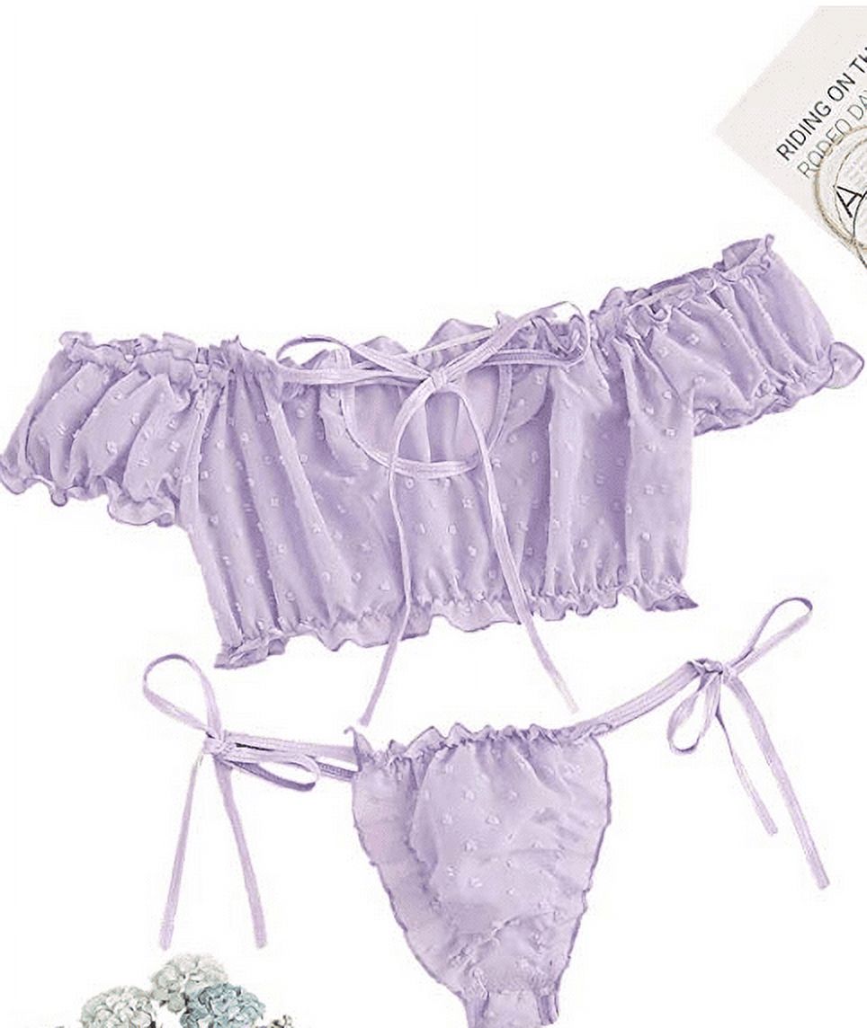 Eyicmarn Womens Bra And Tong Lingerie Set Sexy Two Piece Tie Ruffle Trim Dobby Mesh Homewear is a popular picture for sexy and hot.
