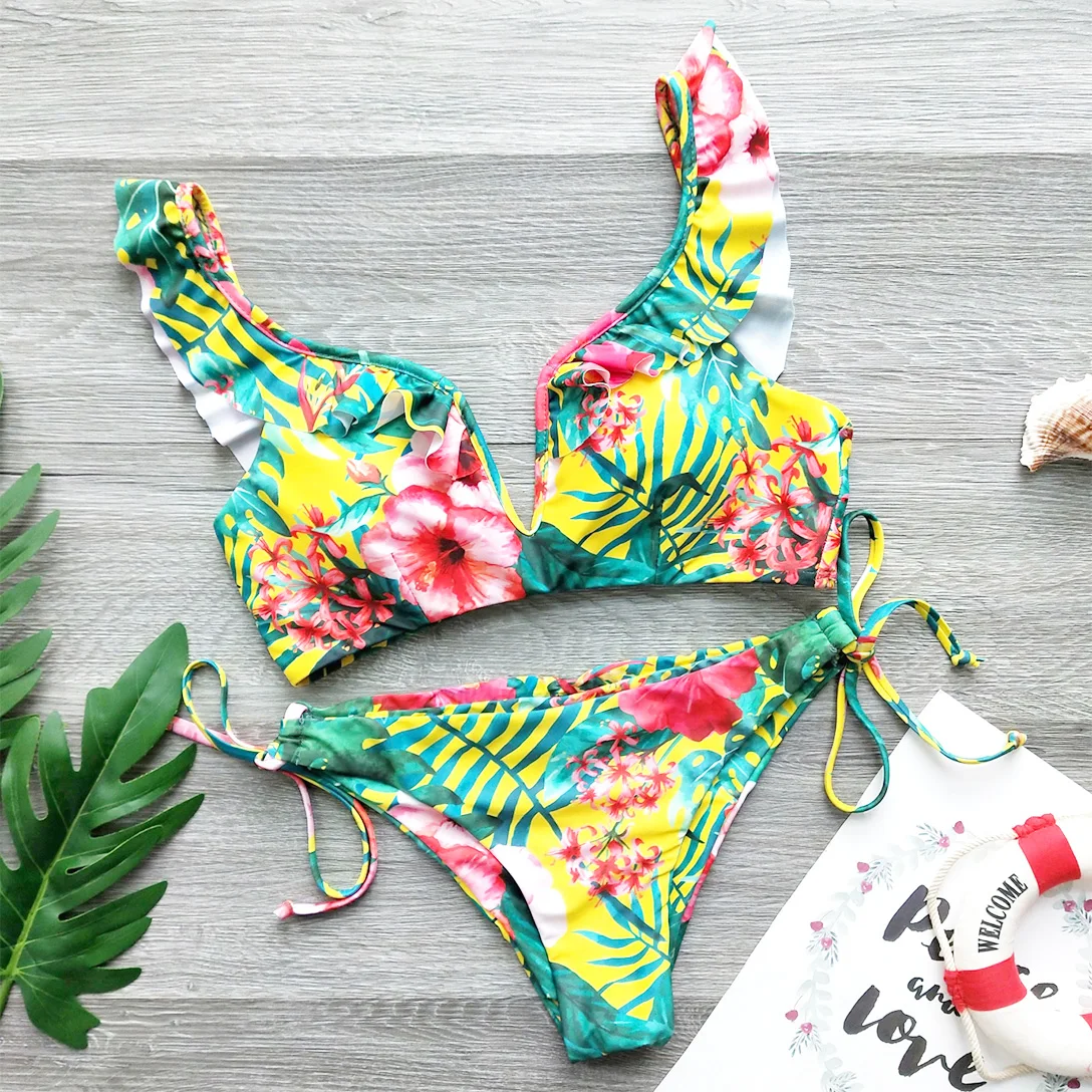 Tag : Female Floral European And American Wide Shoulder Ruffles Straps Bikini Sexy Women Bikini Set