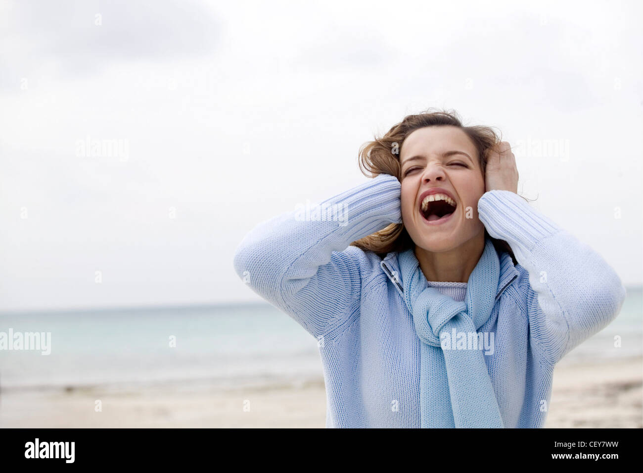 Female Long Blonde Hair Wearing Pale Blue Zip Up Jumper And Matching Scarf Standing On Beach Sea