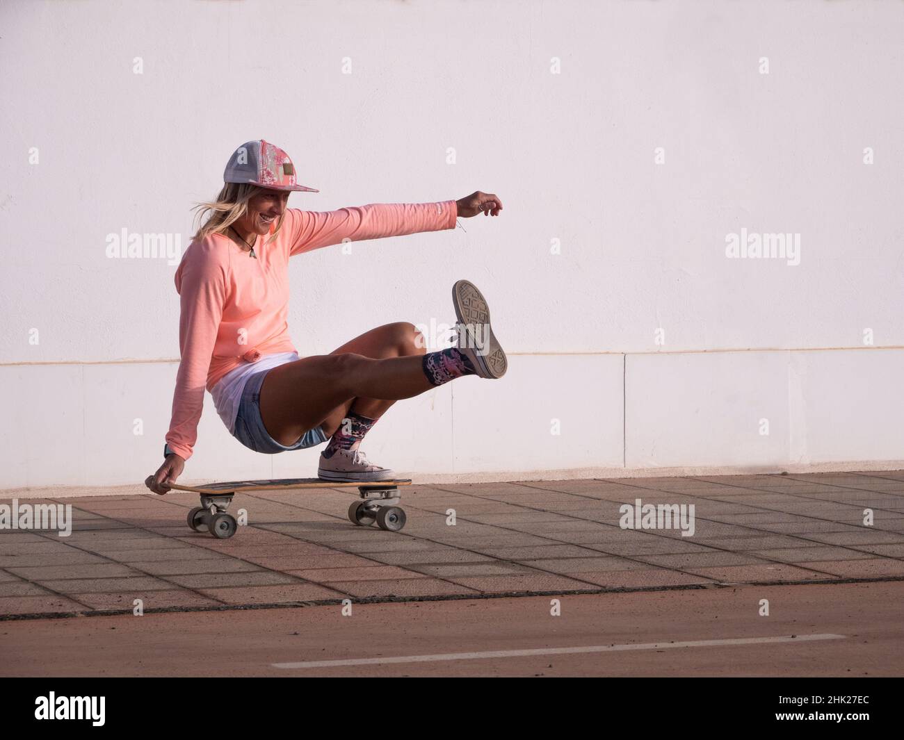 Femme De Patineuse Blonde De Race Blanche Faisant Un Tour Sur Le Skateboard Elle Sourit Et S is a popular picture for sexy and hot.