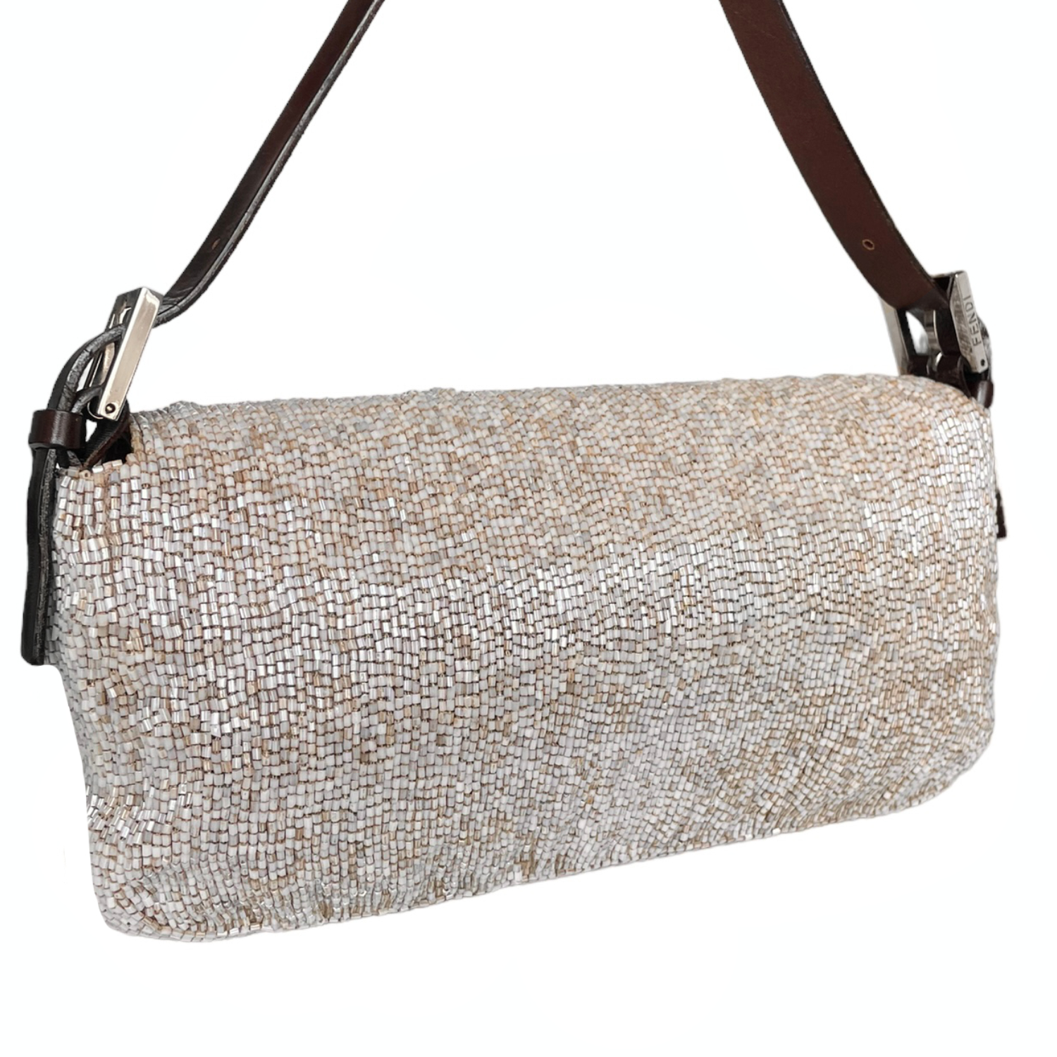 Tag : Fendi Beaded Shoulder Baguette Bag In Nude Brown Nitryl