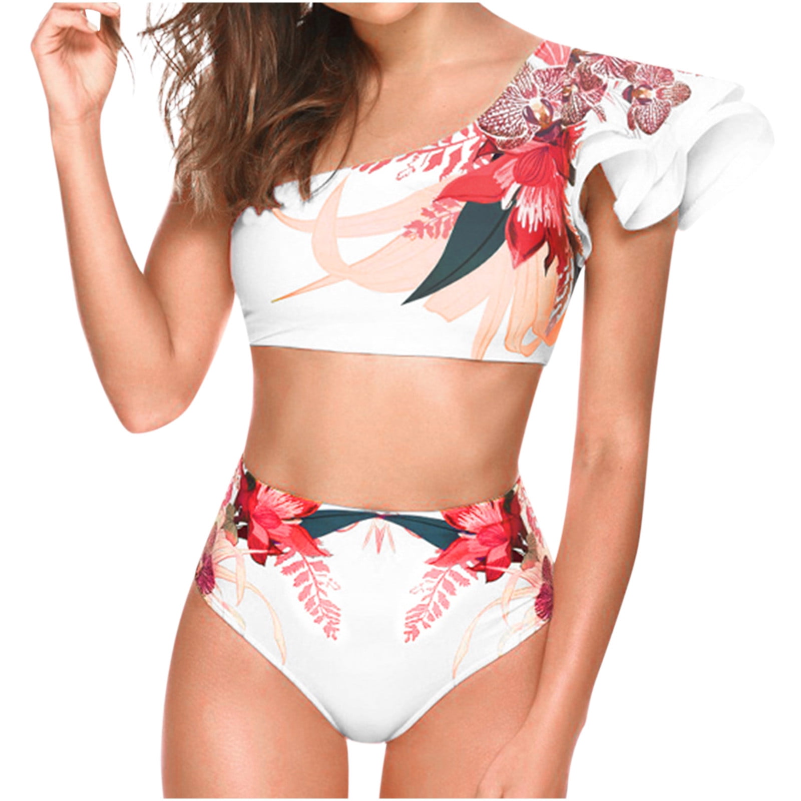 Floenr Two Piece Women S Sexy Bead Stripes Bikini Set One Shoulder Floral Print Halter Ruffled