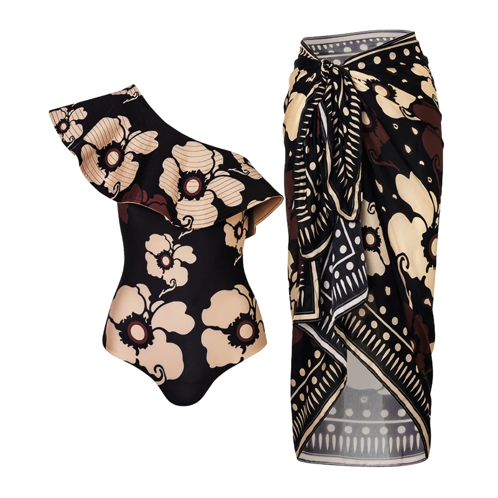 Tag : Flower Print One Piece Swimsuit One Shoulder Flute Side Halter Waist Bikini Sexy Woman