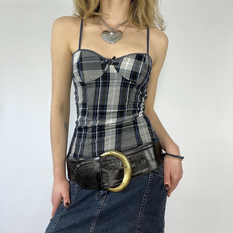Tag : Fongt Fongt New Product Sexy Pure Desire Retro Grid Spell Color Slim Hot Girl Belt Vest Female