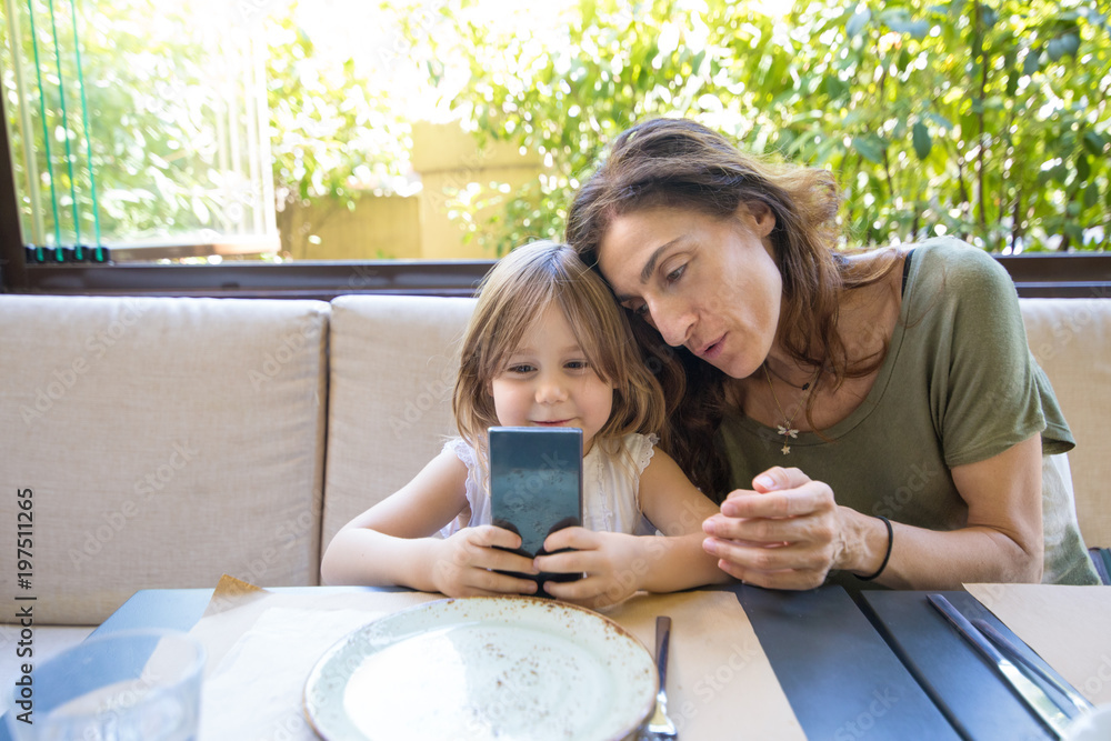 Tag : Four Years Age Blonde Girl With Mobile In Her Hands Smiling And Watching With Woman Mother