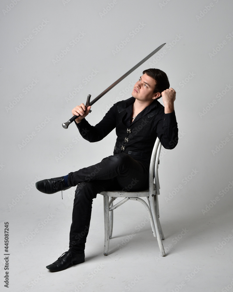Tag : Full Length Portrait Of A Brunette Man Wearing Black Shirt And Gothic Waistcoat Holding Sword