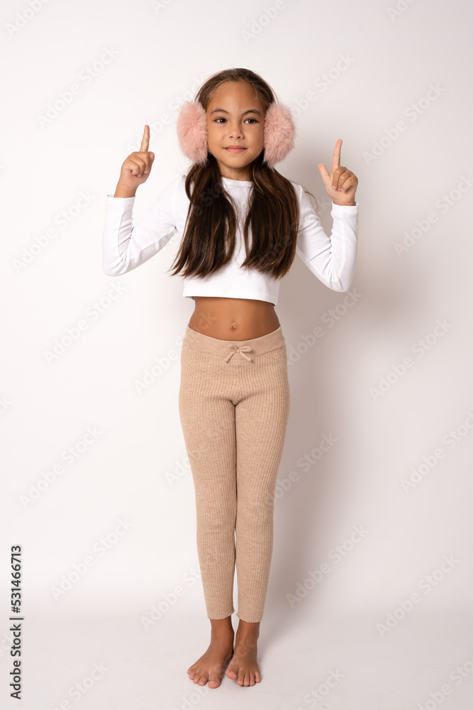 Tag : Full Length Portrait Of Brunette Hispanic Girl In Earmuffs Showing And Pointing Up With Fingers
